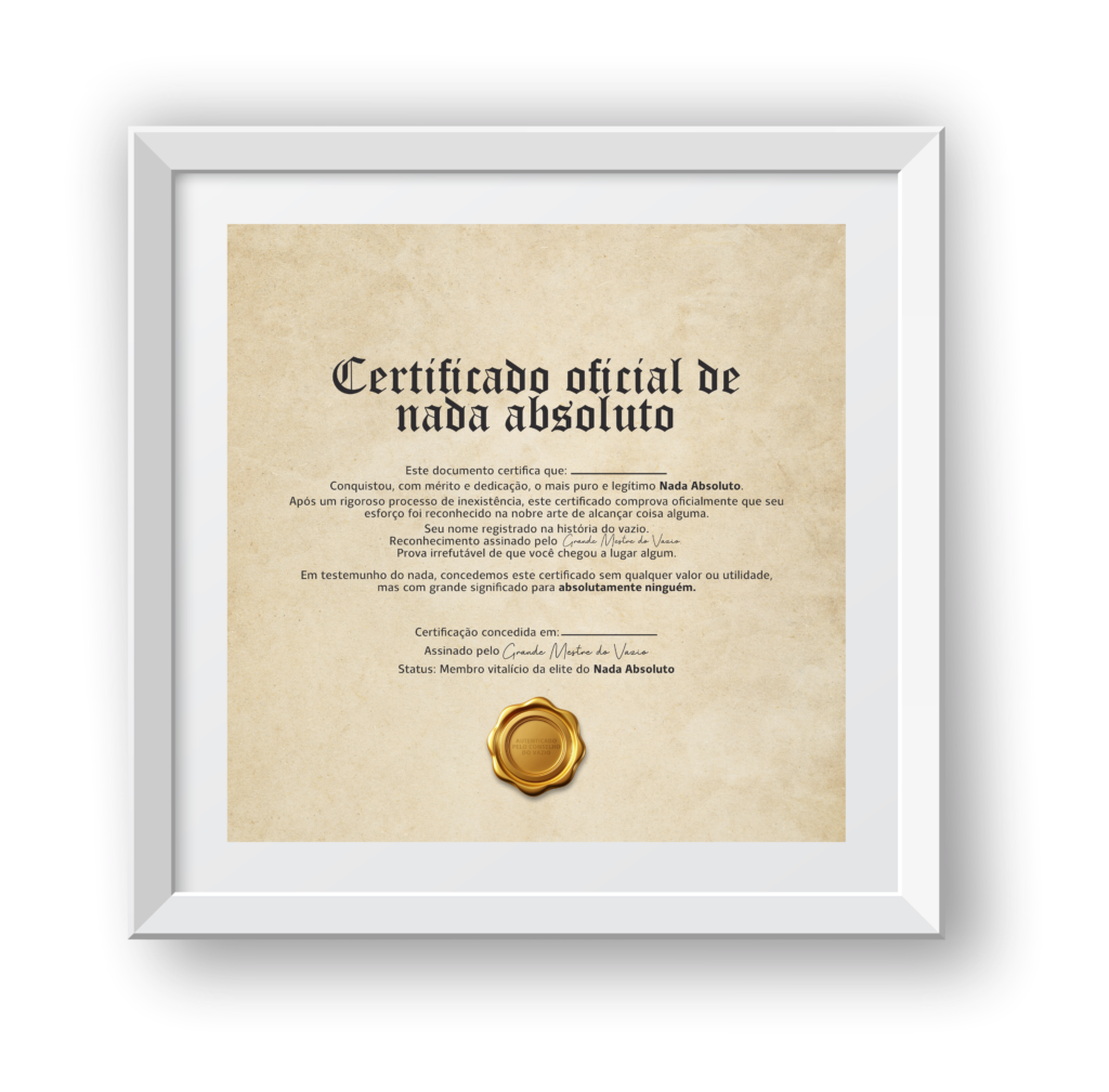 Sabe aquele amigo que vive dizendo que está cansado, que não aguenta mais e que não vê sentido em nada? Agora você pode presenteá-lo com o reconhecimento oficial que ele merece: o Certificado de Nada Absoluto!
